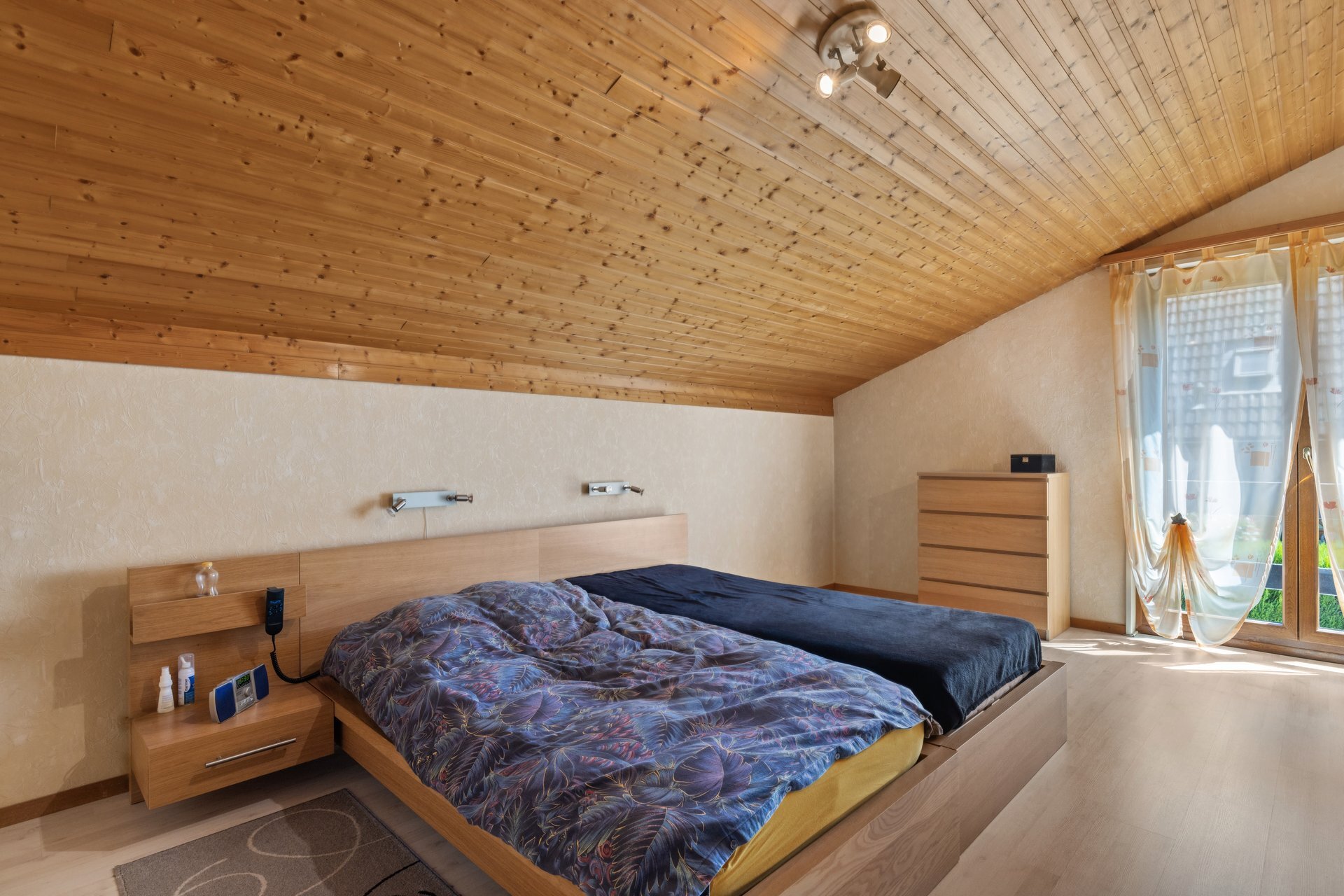 À l’étage, un dégagement dessert trois chambres à coucher, ainsi qu’une salle de bains équipée d’une baignoire et d’un WC. Un WC séparé est également à disposition.